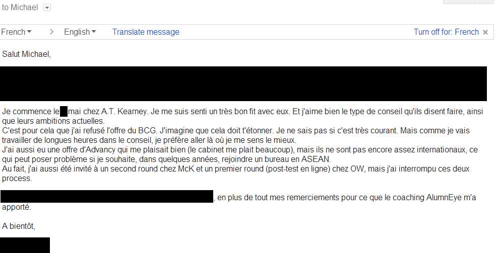 L’apport d’AlumnEye s’est ressenti lors des entretiens eux-mêmes, où j’ai calculé avoir eu un taux de réussite de 85%, en passant notamment des entretiens pour les très sélectifs MBB. » Thibaud a accepté l’offre de A.T. Kearney.